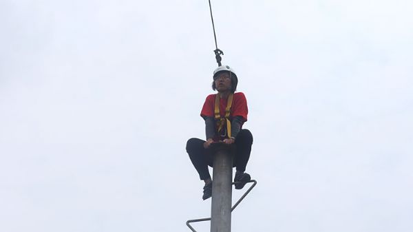 (在队员的鼓励下,邱小红勇敢爬上杆顶)