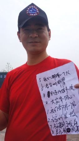 (雄鹰队队长助理朱庆华将歌词贴在胸前)