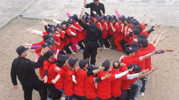 最为搞怪的第三组,取名为“无双队”,“独一无二,天下无双!”是他们的口号。组长曾紫明夸张的表情挥舞着队旗一声令下,队员齐唱:“向前向前向前,我们的团队像太阳,脚踏着五龙的大地,我们是独一无二的团队,我们有战斗的力量。”他们滑稽的表演,让严肃的教练也忍不住笑出声来。(梁婷)