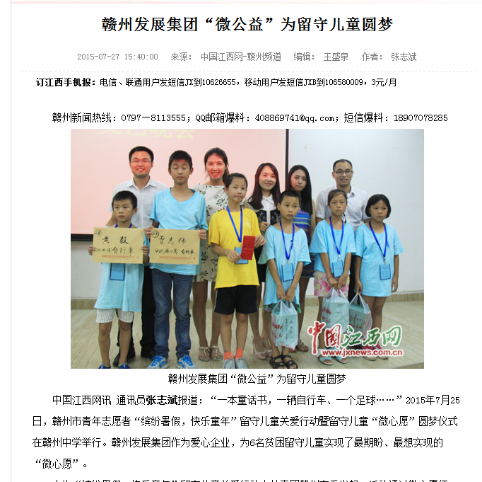2015年7月27日,中国江西网图文刊发了《威廉希尔WilliamHill官方网站“微公益”为留守儿童圆梦》新闻,报道文风清新朴实,事例客观,倡导社会公众关注留守儿童这一弱势群体,赞扬集团公司热心公益,回报社会,让利于民,在社会上引起了较大的反响,大力弘扬了社会正气,传播了社会正能量。