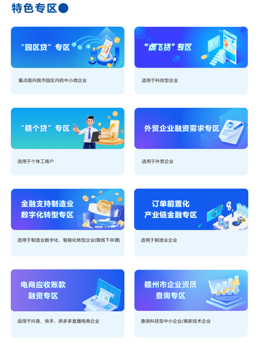2.科技金融支持:针对科技信贷领域“看不懂、不敢贷”的顾虑,虔融信服平台打造了集政策宣贯、银企对接、贷款发放与监测等功能于一体的“虔飞贷”专区,积极共享涉企税费、水电缴纳、公积金社保等数据,协助银行开展信用评估、精准画像,降低银企信息不对称,助推“虔飞贷”模式增量扩面,截至目前,“虔飞贷”投放超15.5亿元,实现18个县(市、区)全覆盖。
