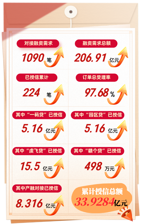 融资服务提质增效。截至目前,平台运行11个月来,对接融资需求1090笔、对接融资需求金额达206.91亿元,银行受理率达97.68%。其中“园区贷”“虔飞贷”等特色产品精准服务小微企业、科技企业等重点群体,市场认可度持续提升。