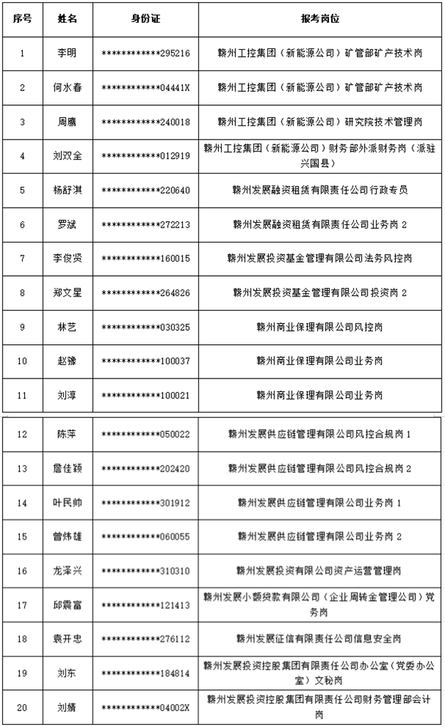 赣州工控集团(新能源公司)副总经理、赣州市纪委监委驻赣州发投集团纪检监察组纪检监察员2个岗位根据有关要求另行公告。赣州工控集团(新能源公司)财务部外派于都县财务岗位的入围候选人已自愿放弃录用资格,经研究,该岗位不再予以递补。
