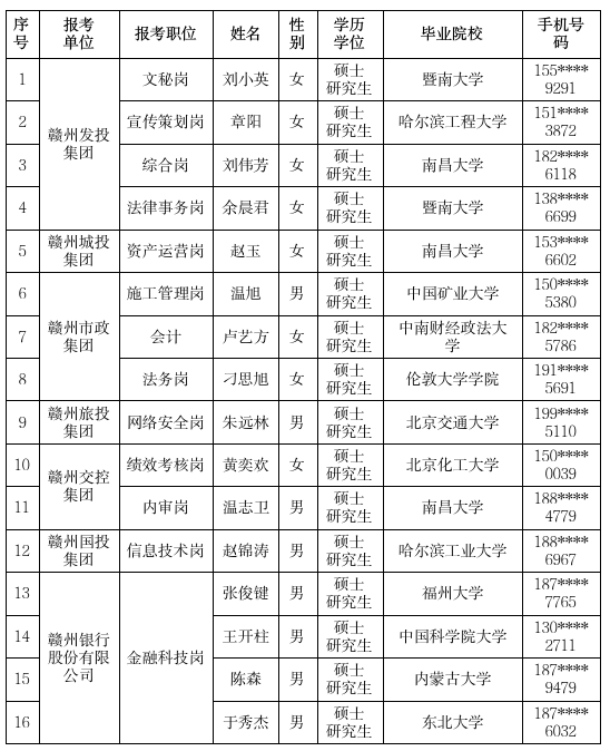 根据《关于举办2024年赣州市“引才聚赣州 携手创未来”组团引才暨“双招双引”活动(东北站)的通知 》,经报名、资格审查、面试、背景调查及体检等程序,现将赣州市属国企2024年组团引才(东北站)拟录用人员名单公示如下: