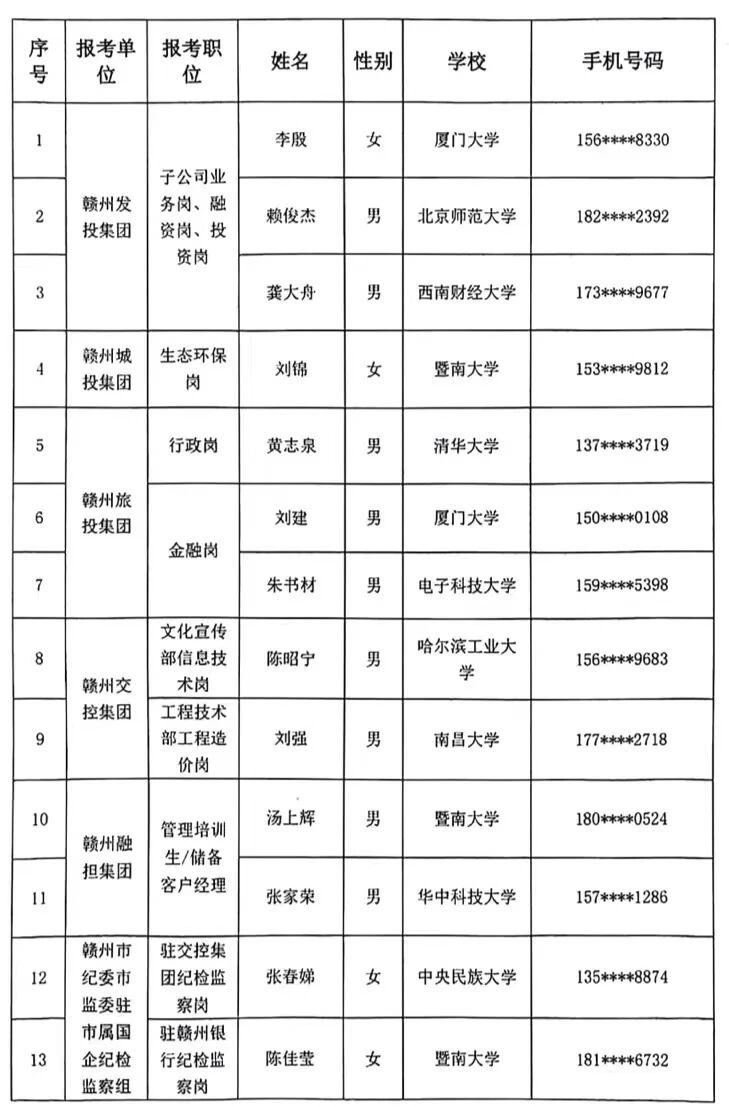 赣州市属国企2024年考核招聘“双一流”高校硕士研究生(成都站)拟录用人员名单公示