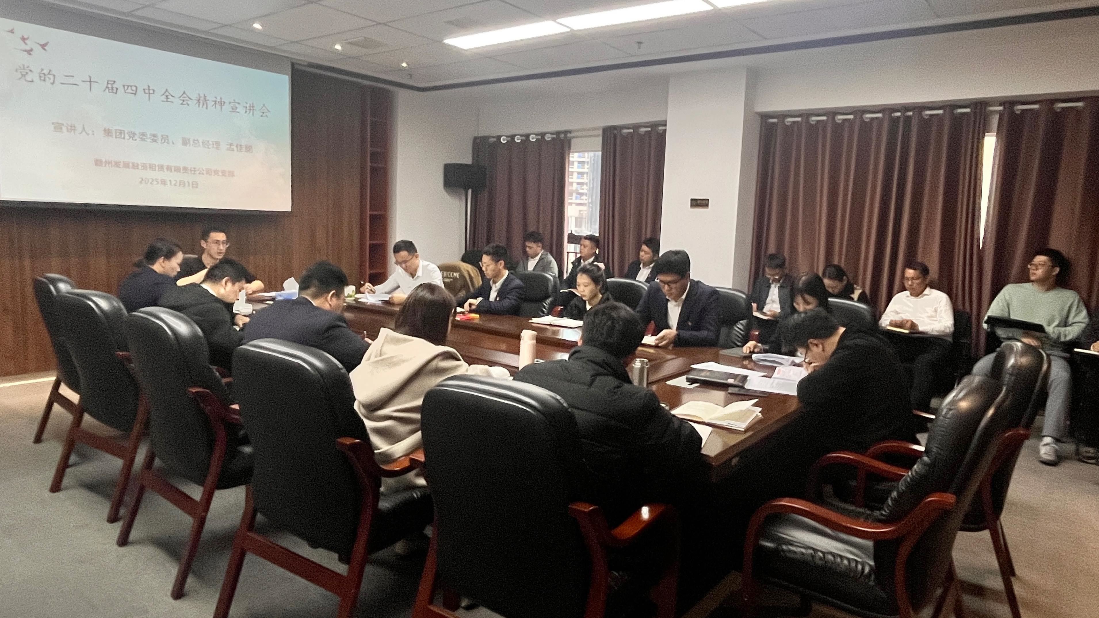 12月1日,为深入学习贯彻党的二十届四中全会精神,威廉希尔WilliamHill官方网站党委委员、副总经理孟佳聪赴挂点联系的赣州发展融资租赁有限责任公司党支部开展专题宣讲。租赁公司党支部全体党员、职工、集团党群工作部有关人员参加宣讲会。